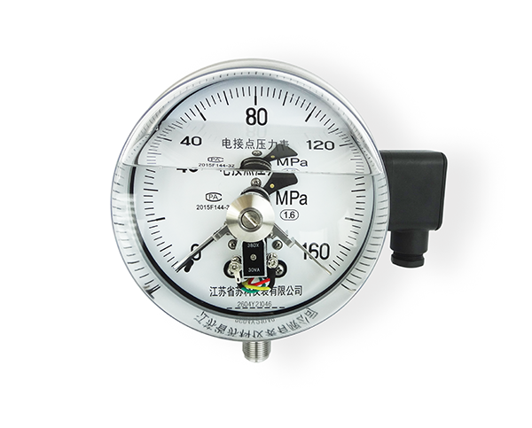 在电接点压力表装置的电接触信号针上,装有可调节的永久磁钢,可以增加接点吸力,加快接触动作,从而使触点接触可靠,消除电弧,能有效的避免仪表由于工作环境振动或介质压力脉动造成触点的频繁关断。所以电接点压力表具有动作可靠、使用寿命长、触点开关功率较大等优点。