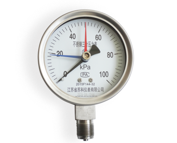 不锈钢三针压力表(也称三针定位压力表)是一种带有三根指针的工业压力测量仪表,主要用于监测和限定工作压力范围,通过不同颜色指针清晰标示当前压力值及上下限报警位置+全不锈钢防腐。