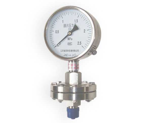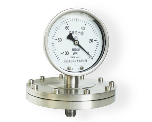 膜片压力表由测量系统(包括法兰接头、波纹膜片)、传动指示机构(包括连杆、齿轮传动机构、指针和度盘)和外壳(包括表壳和罩圈)等组成。膜片压力表外壳为防溅结构,具有较好的密性,故能保护其内部机构免受污秽浸入。